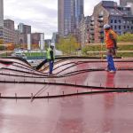 To refine the concrete mix and work out the placement process, S&F cast four mock-up panels before casting the decks. Concrete at the center was 5 inches thick tapering to 3 inches at the perimeter.