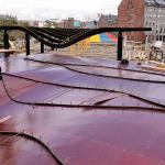 Utile’s group worked out the curved shape and wanted to construct it out of a low-maintenance material with a thin profile at the edge of the roof; concrete was the clear choice. They used Rhino to design the structure and then retained a consultant who specialized in complex geometry—Joe Lamere, a lecturer at the Massachusetts Institute of Technology (MIT). He used parametric modeling to help Utile refine the design shape in order to conform to the bending limits of plywood so forms could be fabricated. For bidding, Genter says, they sent 3D files to subcontractors since two-dimensional plans wouldn’t adequately describe the shape.