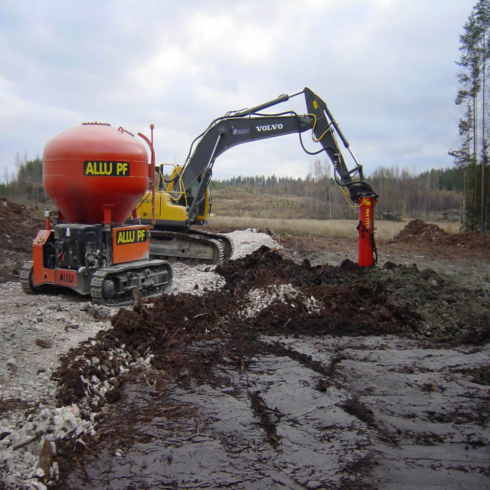The ALLU Stabilization System consists of three components that increase the strength and dynamic stiffness of soft soil in order to improve its engineering characteristics and to remediate contaminated soil. The first component is the ALLU PMX Power Mixer, a versatile hydraulic accessory for excavators that mixes up to 23 feet deep. The second is the ALLU PF Pressure Feeder, which injects the binder agent via hoses into the ground. The third component is the ALLU DAC Data Acquisition Control System, which measures, controls and provides data during the stabilization project. The mass stabilization method used by the ALLU Stabilization System is a quick, cost-effective and environmentally friendly solution that improves soft soils by mixing binder into clay, peat, mud or dredged sediments in comparison to traditional methods of piling or soil replacement. It can also be used in treatment of contaminated soils by encapsulating contaminants within the ground and preventing migration to the surrounding areas.